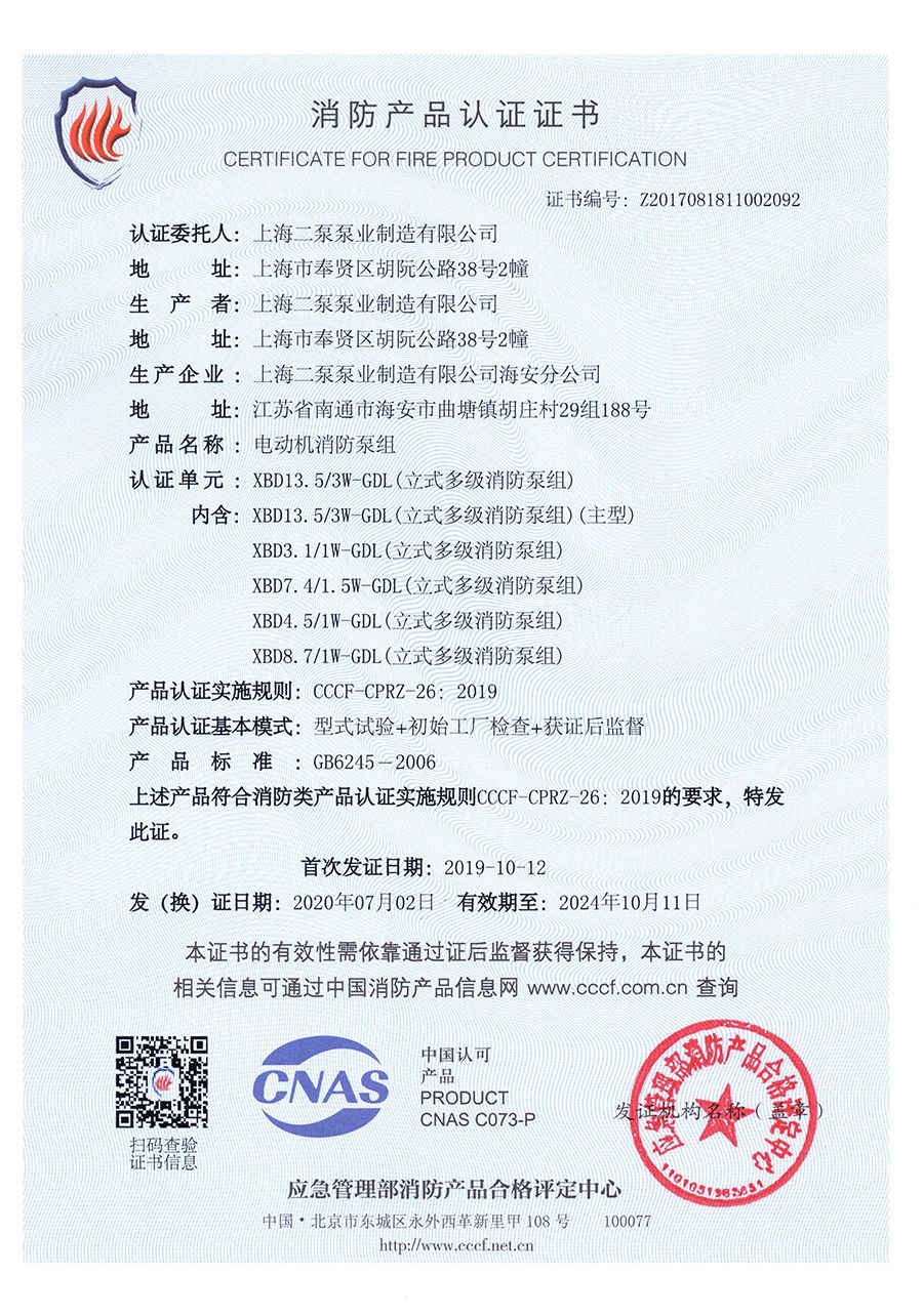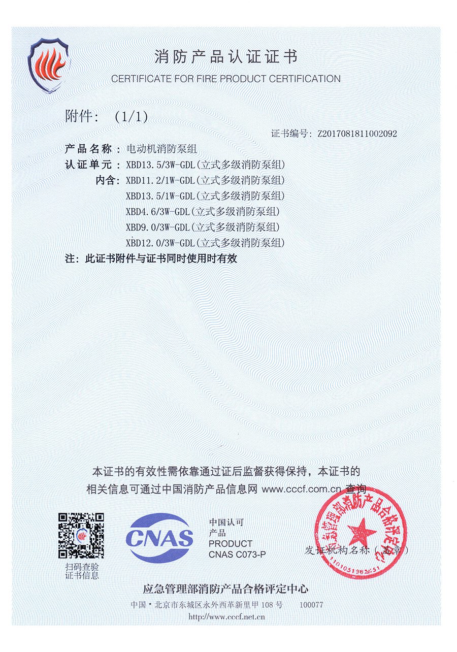 穩壓立式多級GDL-消防產品認證證(zhèng)書