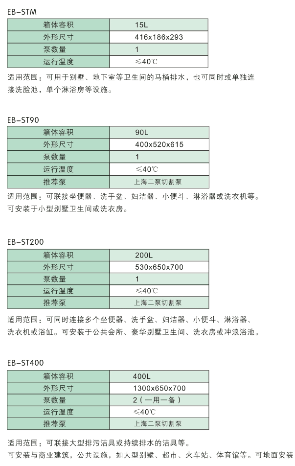 上海芭乐appEB-ST400係列汙水提升器是為大型(xíng)別墅,會所,酒店等中大型建築設計的集汙水收集、存儲和(hé)提升為一體的專用的汙水處理係統。可用於收集廁所排泄物,淋浴,洗手盆,洗衣(yī)機等的(de)液體,並(bìng)泵送到主排汙係統。