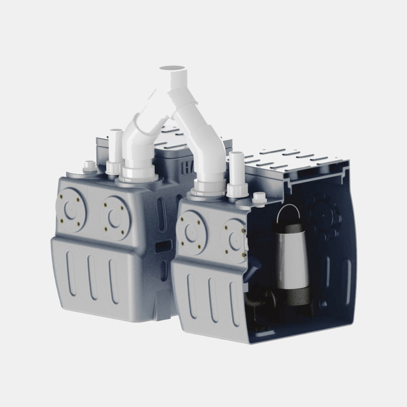 EB-ST400係(xì)列(liè)汙水(shuǐ)提升器可配置一台(tái)輔泵, 用於將箱體外部的(de)積水輸送(sòng)到箱體內。