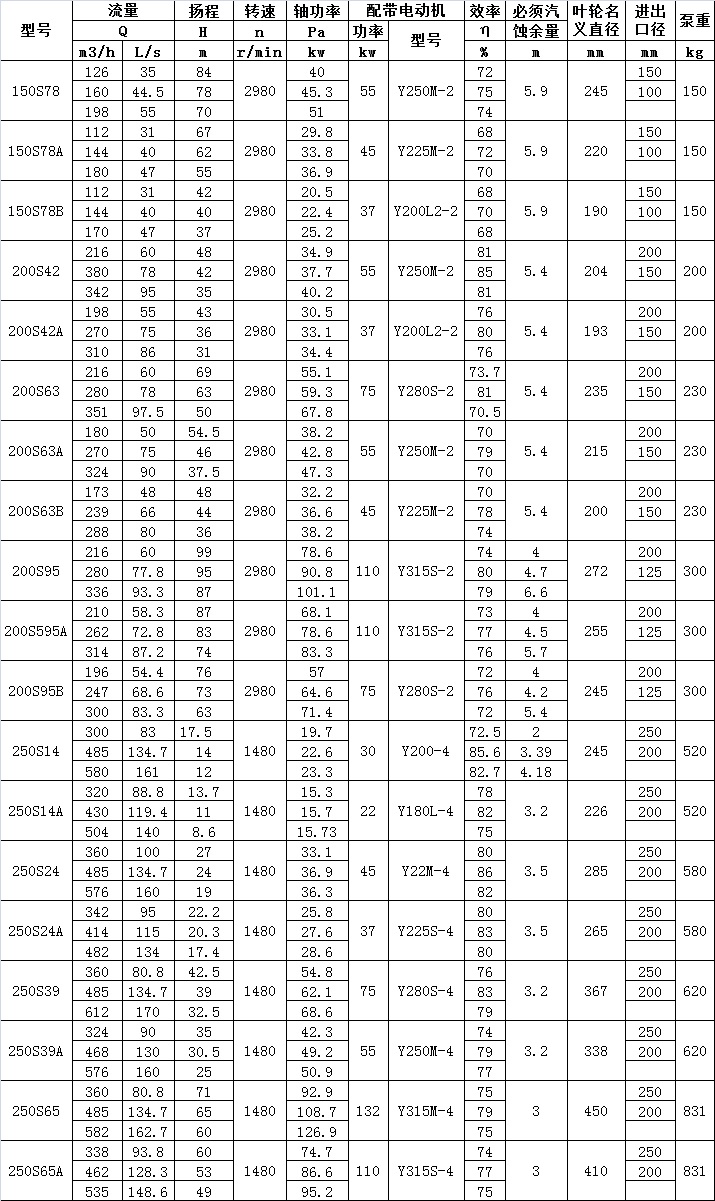 EPOW型/S型單級雙吸(xī)中開泵吸入口和排出口均在泵軸心線下方(fāng),檢(jiǎn)修時,隻要將泵蓋揭(jiē)開,即可將全部零件拆下進行維修。S型泵主要由泵體、泵蓋、軸、葉輪(lún)、密封環、軸套、軸承部(bù)件等組成。其性能符合JB/1050-93《單吸雙吸清水離心泵型式與基本(běn)參數》標準。